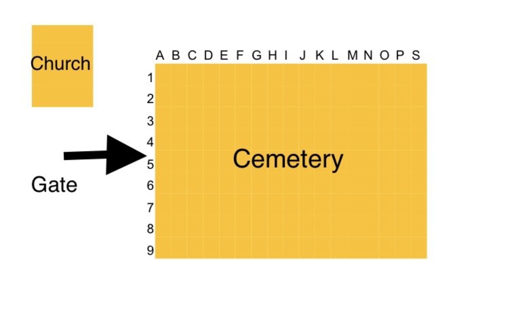 A1 is in the northwest corner of the cemetery. Row A goes from north to south; row 1 goes from west to east. The gate entrance is between row 4 and 5.